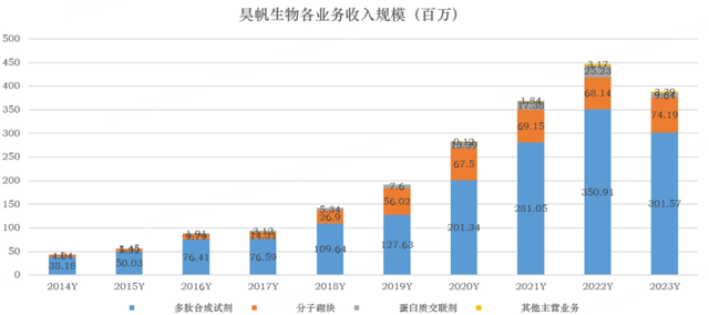 目前,昊帆生物的业务主要有多肽合成试剂、分子砌块和蛋白质交联剂,其中,多肽合成试剂占总收入的77%: